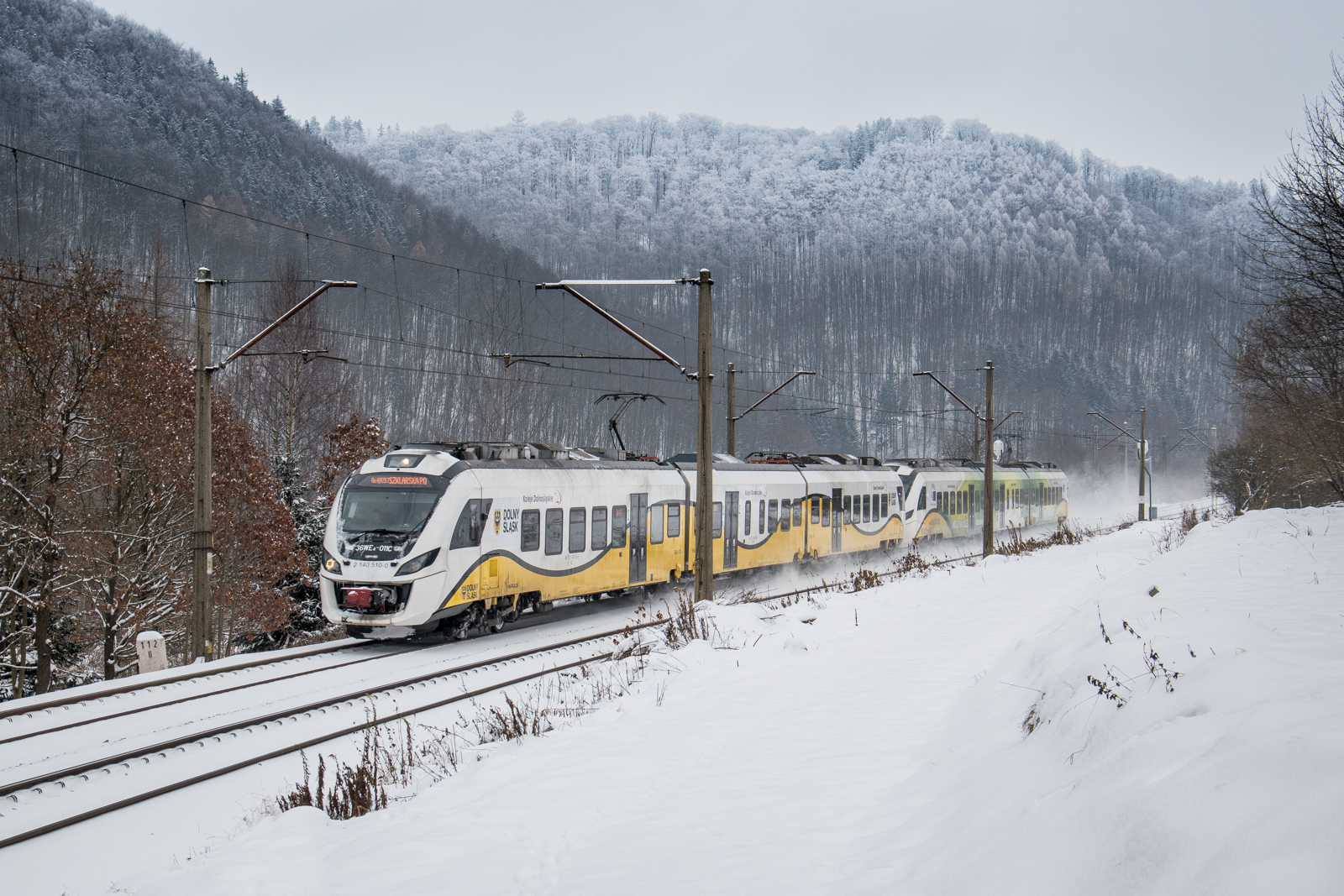 Duet Impulsów KD z pociągiem relacji Wrocław Główny - Szklarska Poręba Górna na szlaku Marciszów - Janowice Wielkie. Jako drugi w zestawie jedzie 36WEa-012 w okleinie. W tle możemy zobaczyć "zabielone" góry Ołowiane.