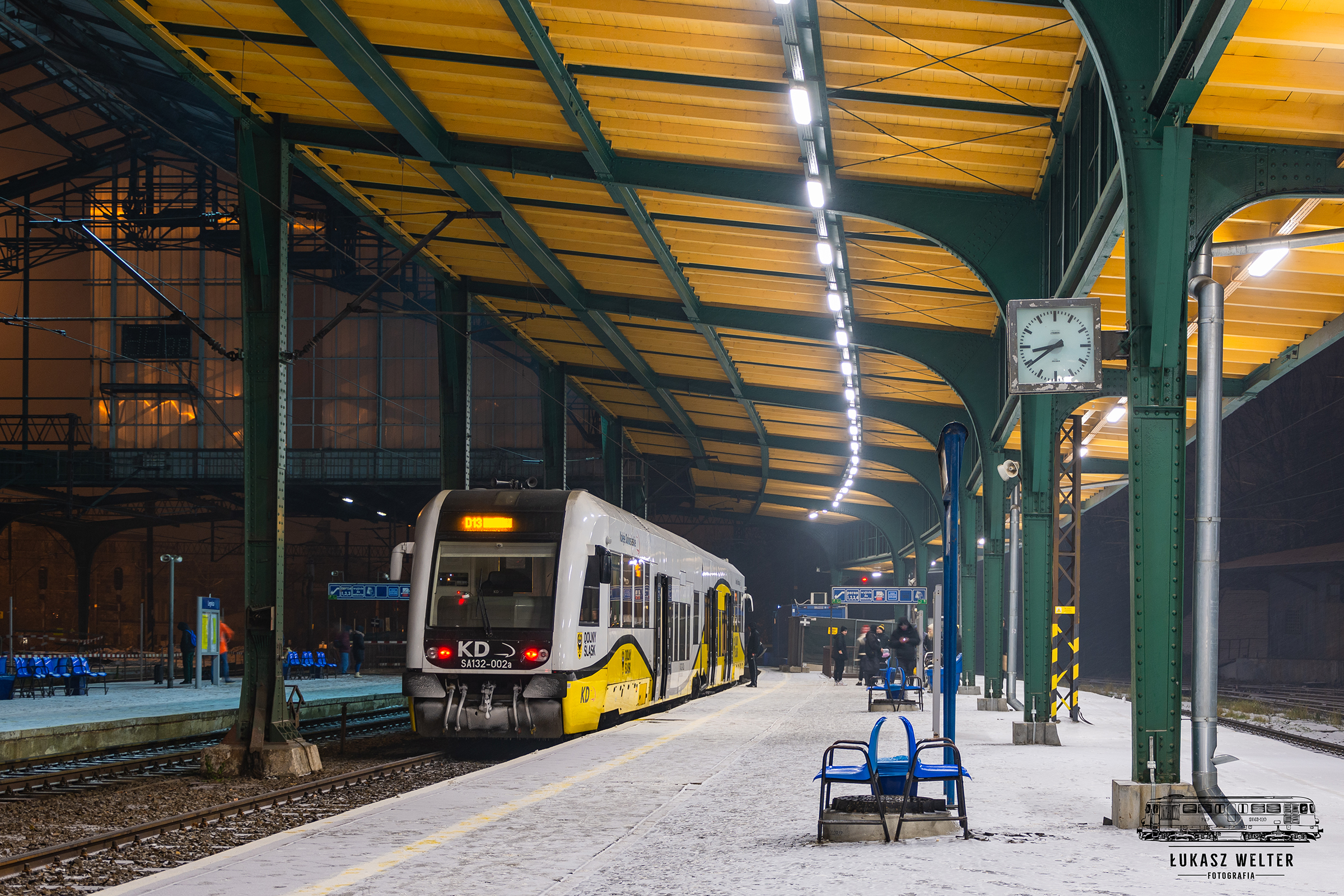 SA132-002 Kolei Dolnośląskich w relacji Legnica - Chocianów KD60445 z ostatnim tego dnia kursem, za chwile odjedzie z peronu 5 legnickiego dworca.