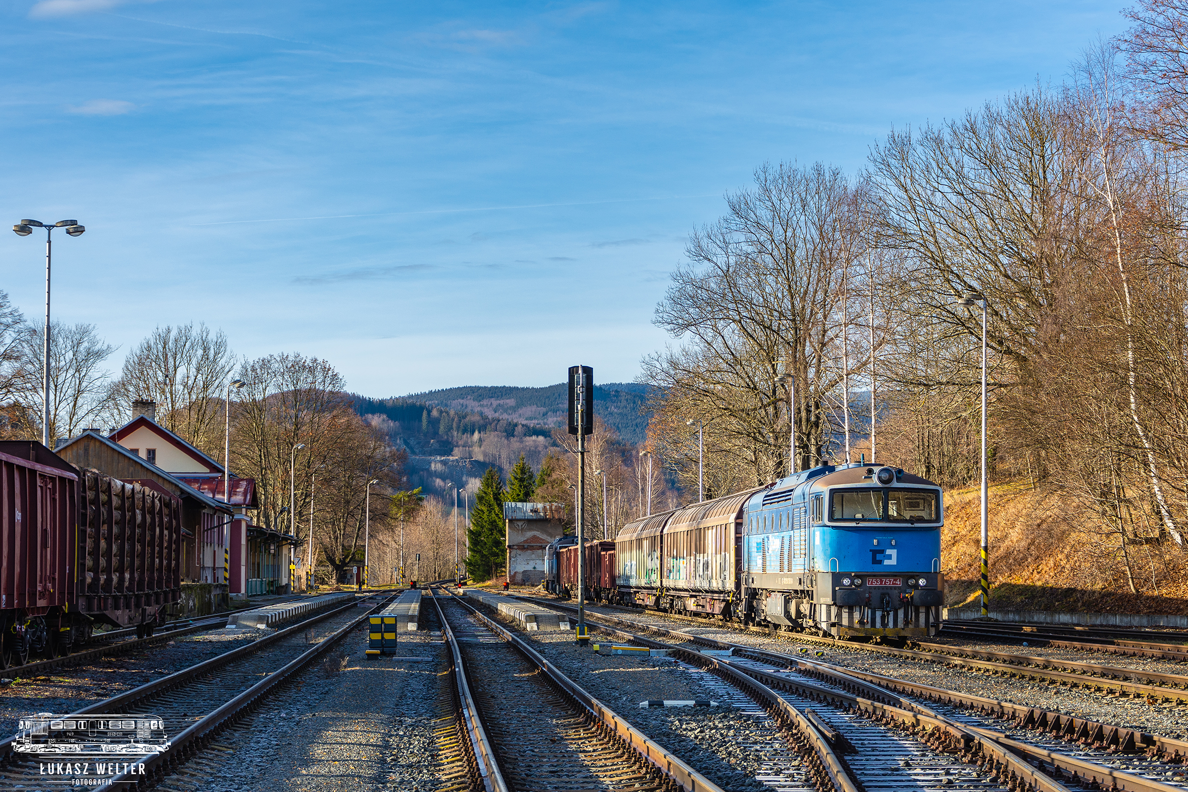 Duet nurków w postaci 753 757-4 i na popychu krótkiej zdawki 753 766-5, stoją sobie wygaszone na stacji Lipová-lázně, gdzie za około 2h, drużyna trakcyjna dostanie gotowe papiery, a po przestawieniu się na tor obok ruszy w drogę do stacji Krnov jako pociąg 62683, po drodze wjeżdżając na chwile do Głuchołaz aby zmienić kierunek jazdy.