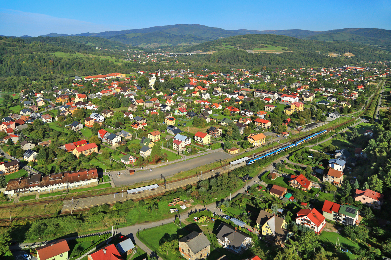 Stacja kolejowa w Beskidzie Żywieckim Milówka na którą właśnie wjeżdża pociąg Kolei Śląskich Sprinter Rachowiec w postaci duetu Elfów relacji Gliwice - Zwardoń. Na wprost widoczna Barania Góra 1220 m n.p.m. spod której wypływa źródło Wisły, a w zasadzie dwa źródła-Czarna Wisełka z wysokości 1107 m n.p.m. oraz Biała Wisełka z wysokości 1080 m n.p.m. Oba potoki łączą się w Jeziorze Czerniańskim ( w Wiśle z drugiej strony widocznej góry) i dalej płyną jako Wisła.