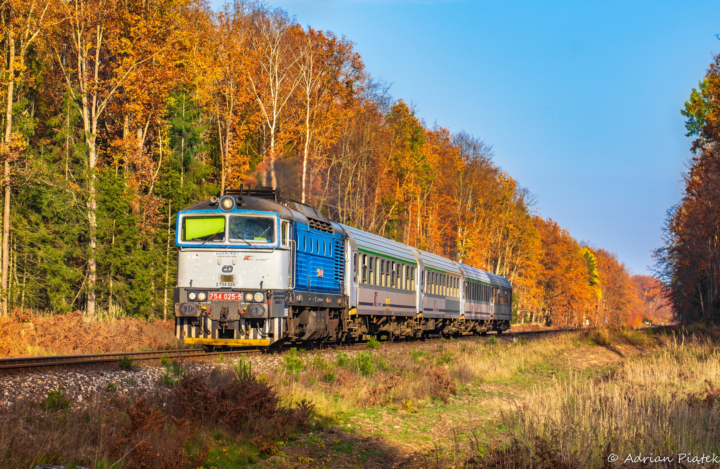 754 025 ze Staszicem do Szczecina Głównego przemierza złote lasy w okolicach Strączna. Tego dnia pogoda była wyśmienita, temperatura pozwalała na poruszanie się "na krótko" co jak na koniec października było dość ciekawą anomalią. Lasy w tej okolicy są pięknie zagęszczone, a kilkukilometrowa przechadzka obok torów była czystą przyjemnością :)