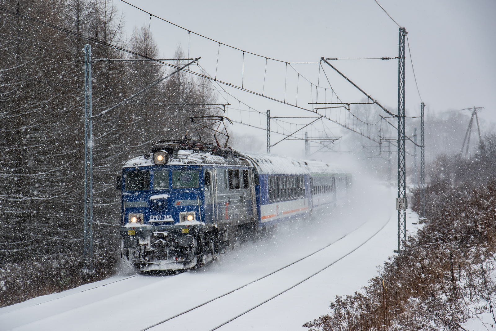 EP07-383 przecina obficie spadające płatki śniegu z pociągiem TLK "Orzeszkowa" do Warszawy. Skład zbliża się do stacji w Wojanowie. Dzisiejszego dnia (28.01.2023) większość pociągów jadących przez Wałbrzych (m.in. Orzeszkowa) zostało odwołanych na poszczególnych odcinkach z powodu powalonych drzew na tory. Aura jaka powstała w wałbrzyskich okolicach to przede wszystkim zamarzające opady, które powodują łamanie się drzew jak zapałki i tworzą na wszystkim pokrywy lodowe.