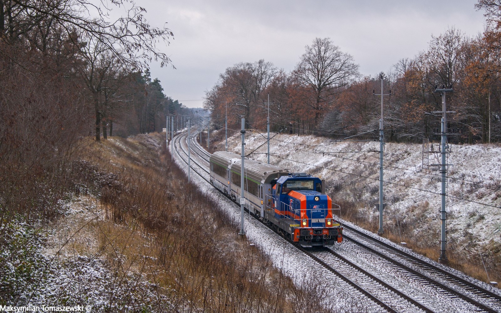 ... skład dalekobieżny na E30, czyli IC Hetman z Zielonej Góry do Lublina. Pociąg do Wrocławia prowadzi SU4220-012, która z "zawrotną" prędkością 90km/h zbliża się właśnie do stacji Malczyce. Jeszcze do 2007/2008 roku w miejscu, w którym znajduje się "Hetman" stał wiadukt nieczynnej i rozebranej w 2014 roku linii 315 Malczyce - Jawor. Drugi wiadukt tej linii (położony również w Mazurowicach) nad bocznicą do bazy paliw istnieje po dziś dzień.