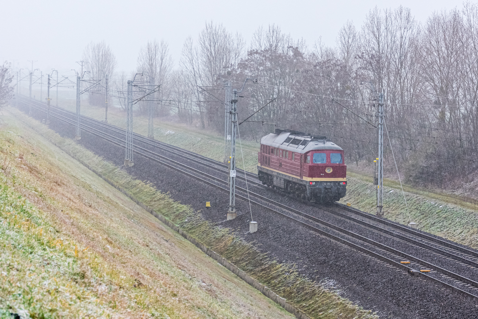 Ludmiła w historycznych barwach kolei wschodnioniemieckich Deutsche Reichsbahn mija luzem podczas opadów śniegu Łosiów jadąc szlakiem Lewin Brzeski - Brzeg w stronę Wrocławia.