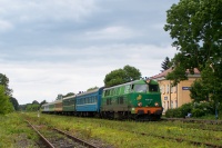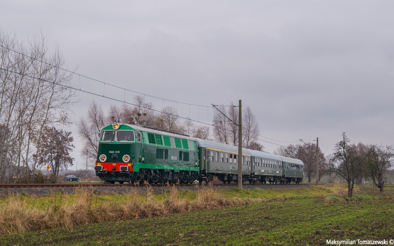 Wrocławski fiat SU45-079 z pociągiem specjalnym "Badacz" Turkol-u powoli przemieszcza się bocznicą ze stacji Żmigród na tor doświadczalny w Węglewie, na którym wykona dwa okrążenia. Były to ostatnie przejazdy tej lokomotywy na "turkolach" w 2022 roku, kolejne odbędą się 26 marca, kiedy to fiat poprowadzi wybrane pociągi z oferty "Wiosna 2023".