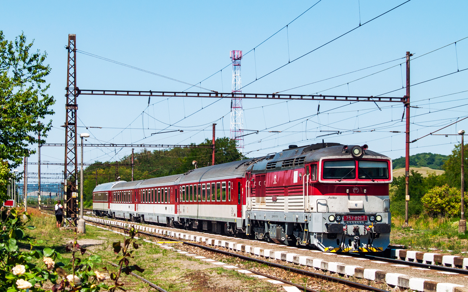 Jozko, czyli 757 021 prowadzi jeden z pociągów REX z Koszyc do Humennego. Stacja Nižná Myšľa jak na realia wschodniej Słowacji ma całkiem zadbane okolice budynku stacyjnego. Są klomby z różnymi kwiatami, betonowe donice oraz białe krawężniki. O samym budynku dworca nie można niestety już tak powiedzieć.