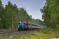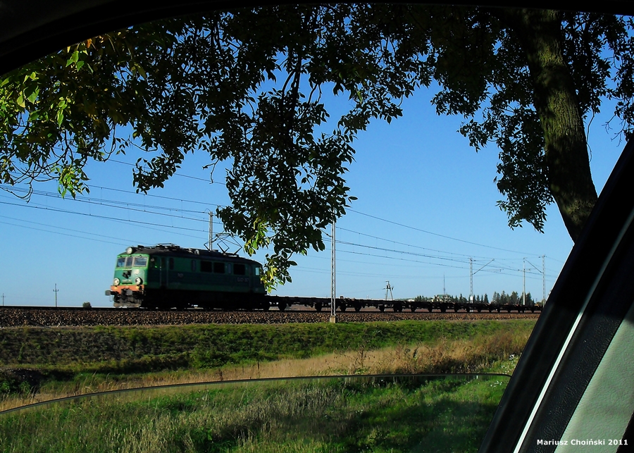 30/09/2011/ ROGÓW - EU07 z pustymi platformami widziana ze samochodu stojącego na przejeździe, sunie w stronę Koluszek.