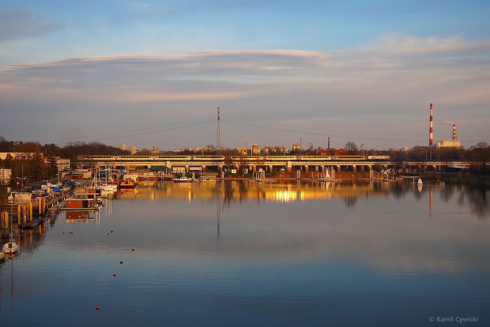 Niezidentyfikowana EP09 z opóźnionym 30 minut pociągiem IC 5602 "Heweliusz" rel. Gdynia Główna - Wrocław Główny mija most na Odrze. Na pierwszym planie wrocławska marina w Porcie Osobowice.