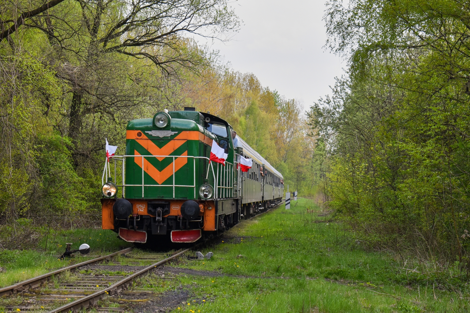 SM42-742 z pociągiem TurKol "Rudy" rel.Katowice-Tarnowskie Góry (Przez Zabrze, Bytom Karb i Radzionków) pokonuje szlak Ruda Chebzie-Zabrze Biskupice, jadąc w kierunku Bisek. Skład mija dawny podg.Orzegów. Flagi na lokomotywie zostały założone w celu uczczenia święta konstytucji 3 Maja.