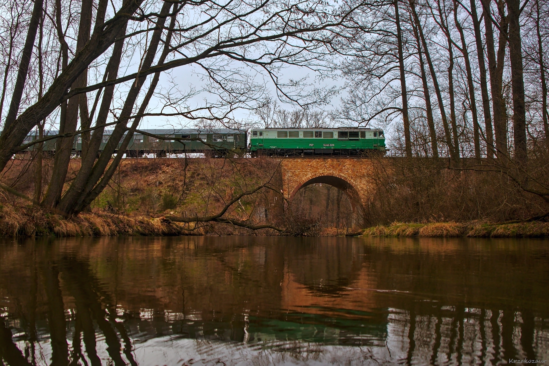 Przyszedł czas na to co tygryski lubią najbardziej. Wszedłem pod wiadukt, prawie położyłem się w wodzie i czekałem na pociąg. Chwilę przed piętnastą od strony Żar nadjechał potężny skład z piękną lokomotywą na czele i polsatem na popychu.
