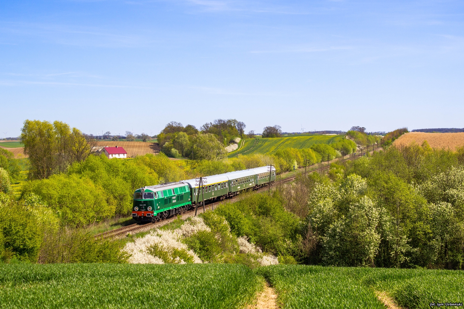 SU45-079 z pociągiem ''Klimek'' relacji Grudziądz - Mełno - Grudziądz na szlaku Grudziądz - Mełno
