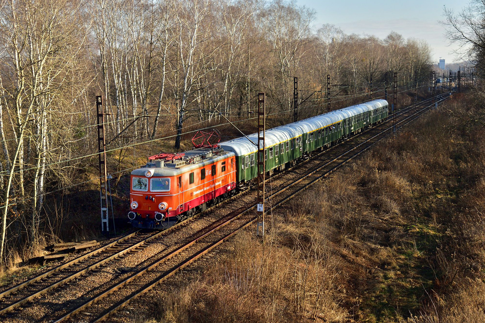 EP05-23 z pociągiem TurKol "Górnik" Relacji Katowice-Bytom-Katowice [Do Bytomia przez Rudę Kochłowice i Zabrze Biskupice, a z Bytomia przez Gliwice i Chorzów Batory] pokonuje szlak Ruda Bielszowice-Zabrze Makoszowy, w kierunku Makoszów.