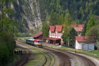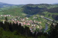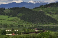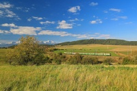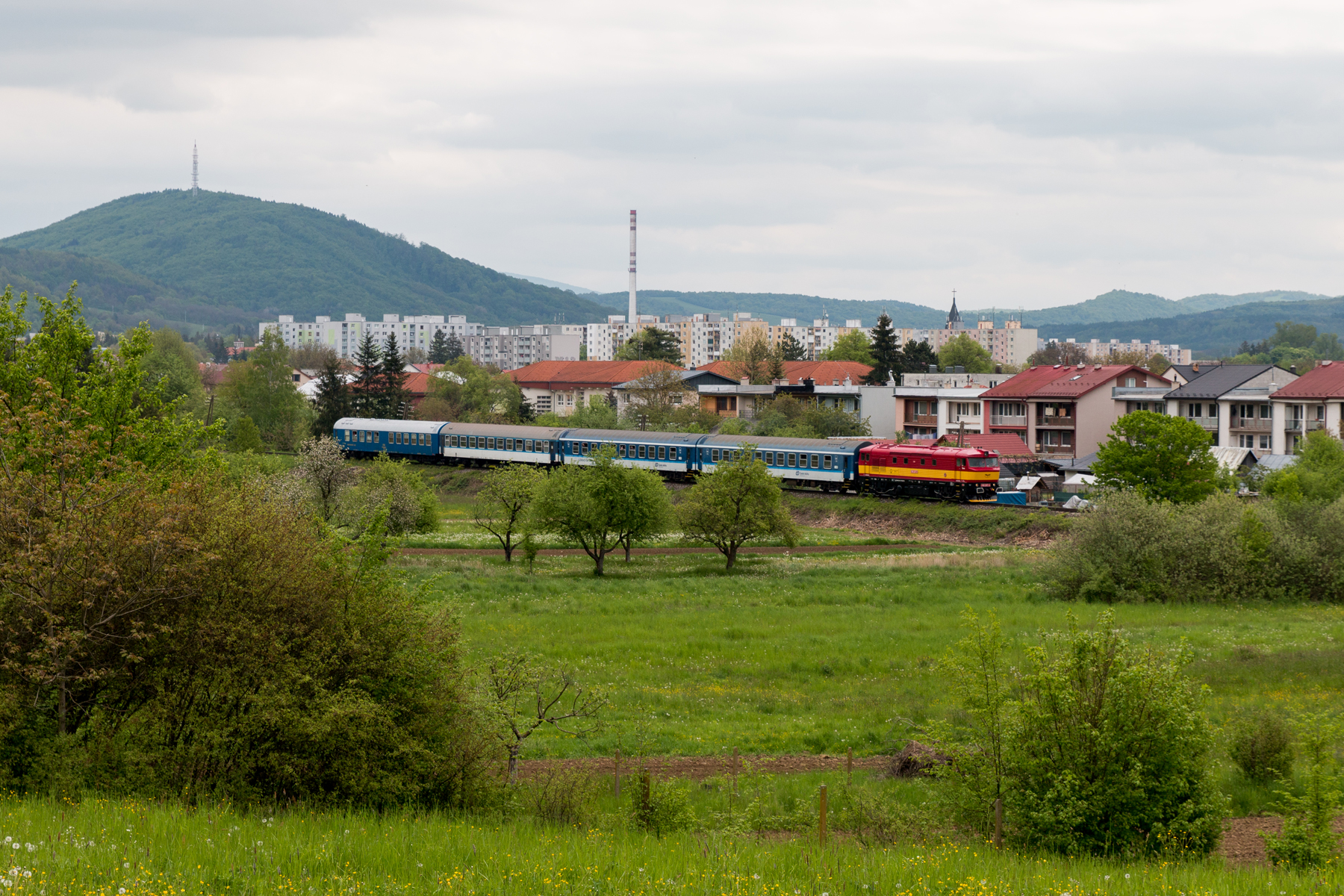 Pociąg specjalny Zr 31098 relacji Stakčín - Dobšinská Ľadová Jaskyňa prowadzony lokomotywą 749 247-3, ujęty na tle zabudowy miasta, niedługo po minięciu przystanku osobowego Snina predmestie. Pociąg zorganizowany w ramach imprezy Retro Expres Slovenskem