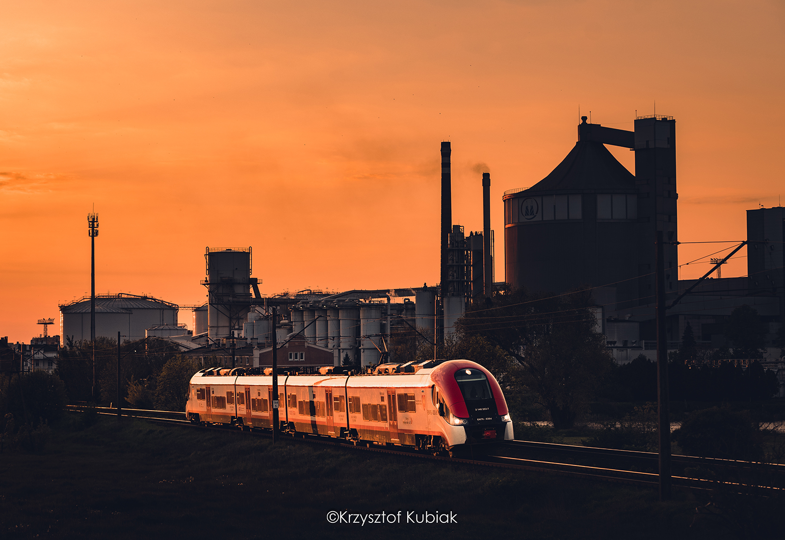 EN76-030 Kolei Wielkopolskich opuszcza Środę Wielkopolską. W tle charakterystyczny dla miasta jeden z silosów miejscowej cukrowni.