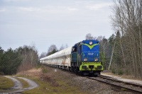 SM31-025 wraz ze składem pociągu towarowego z ładunkiem o przekroczonej skrajni mija okolice wsi Podleś, pokonując szlak Bąk - Kościerzyna.