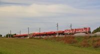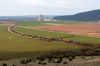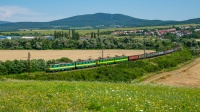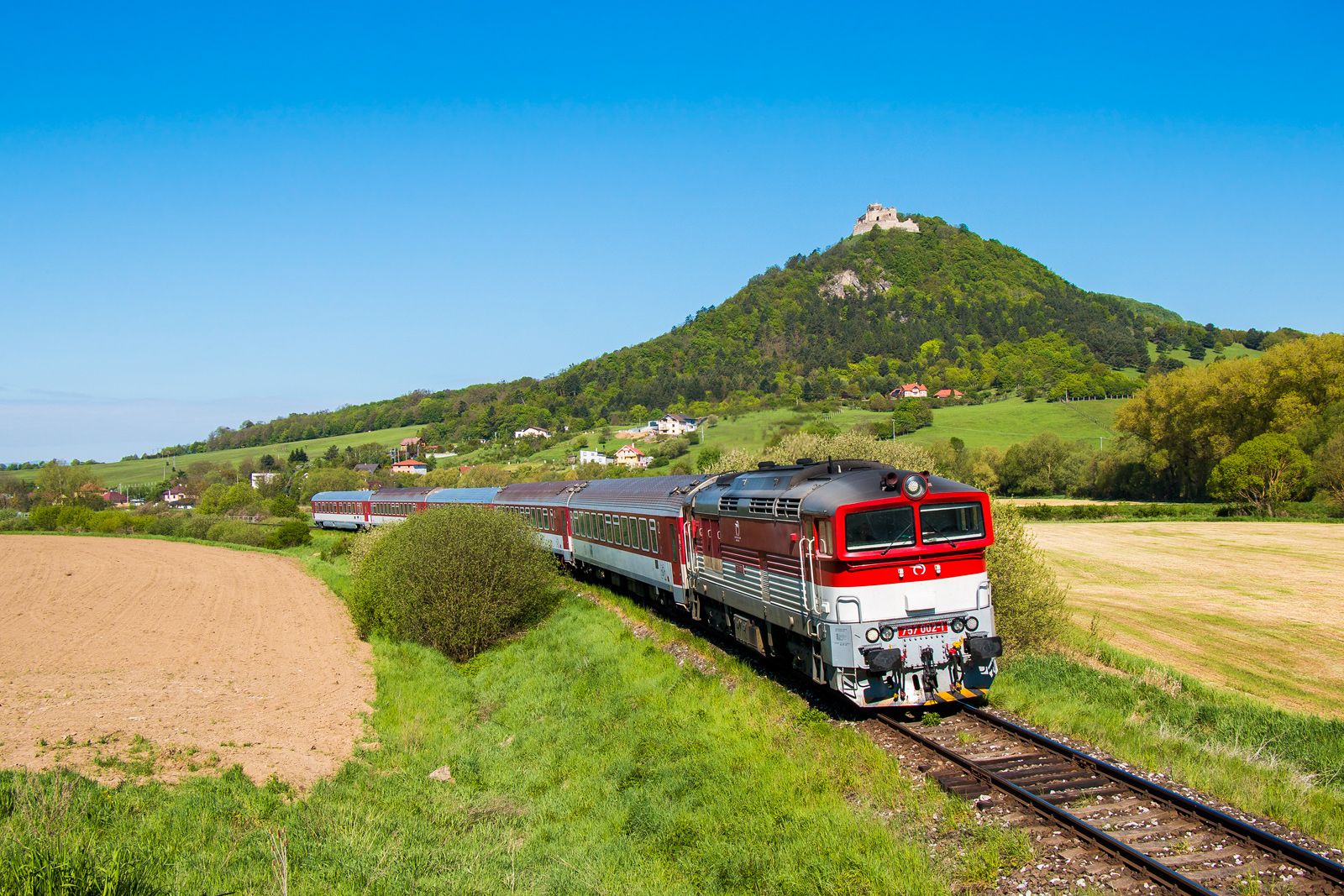 757 002-1 z pociągiem Os 9111 relacji Prešov - Humenne rozpędza się chwilę po opuszczeniu stacji Kapušany pri Prešove. Na górce w tle widać zamek - Kapušanský Hrad.