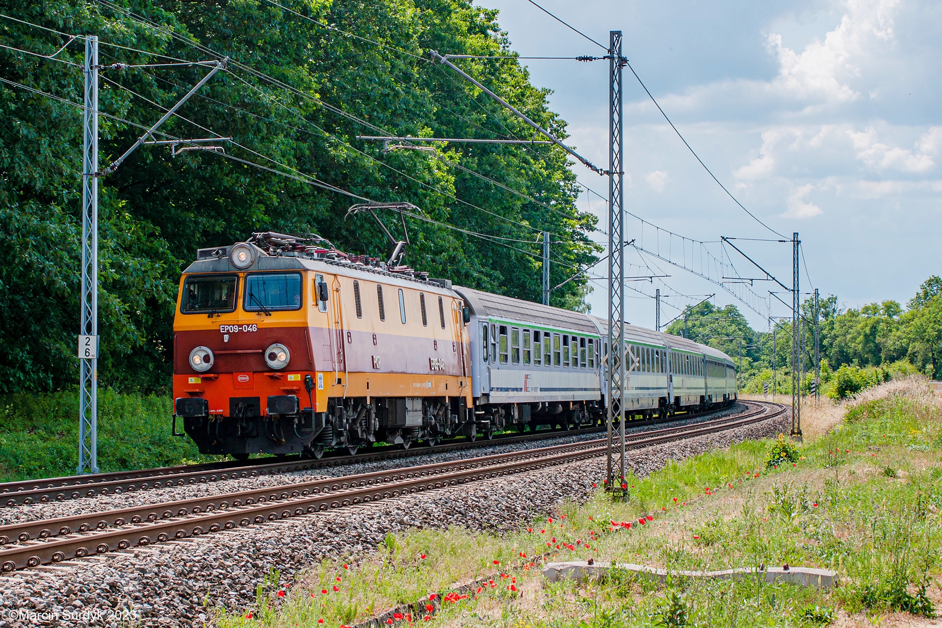 Szlak Poznań Wschód - Kobylnica. EP09-046 z pociągiem IC 3515 "Artus" z Przemyśla Głównego do Gdyni Głównej za kilka sekund minie przejazd w ciągu ul. Bałtyckiej w Poznaniu.