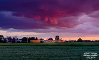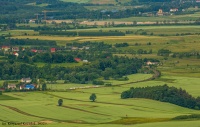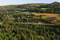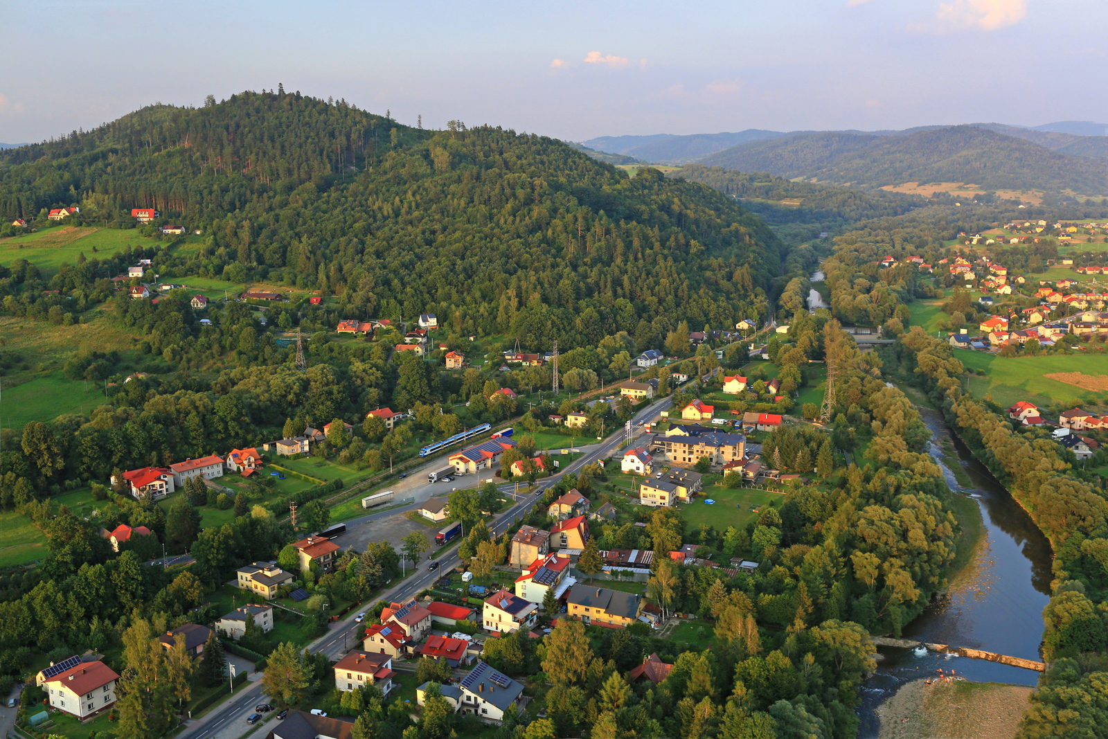 Okolice Żywca widok na Pasmo Pewelskie w Beskidzie Żywieckim. Pociąg Kolei Śląskich SPRINTER ORNAK relacji Zakopane - Katowice jedzie wzdłuż rzeki Koszarawy. Góra po lewej stronie nazywa się Łyska 640 m n.p.m.