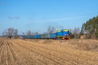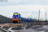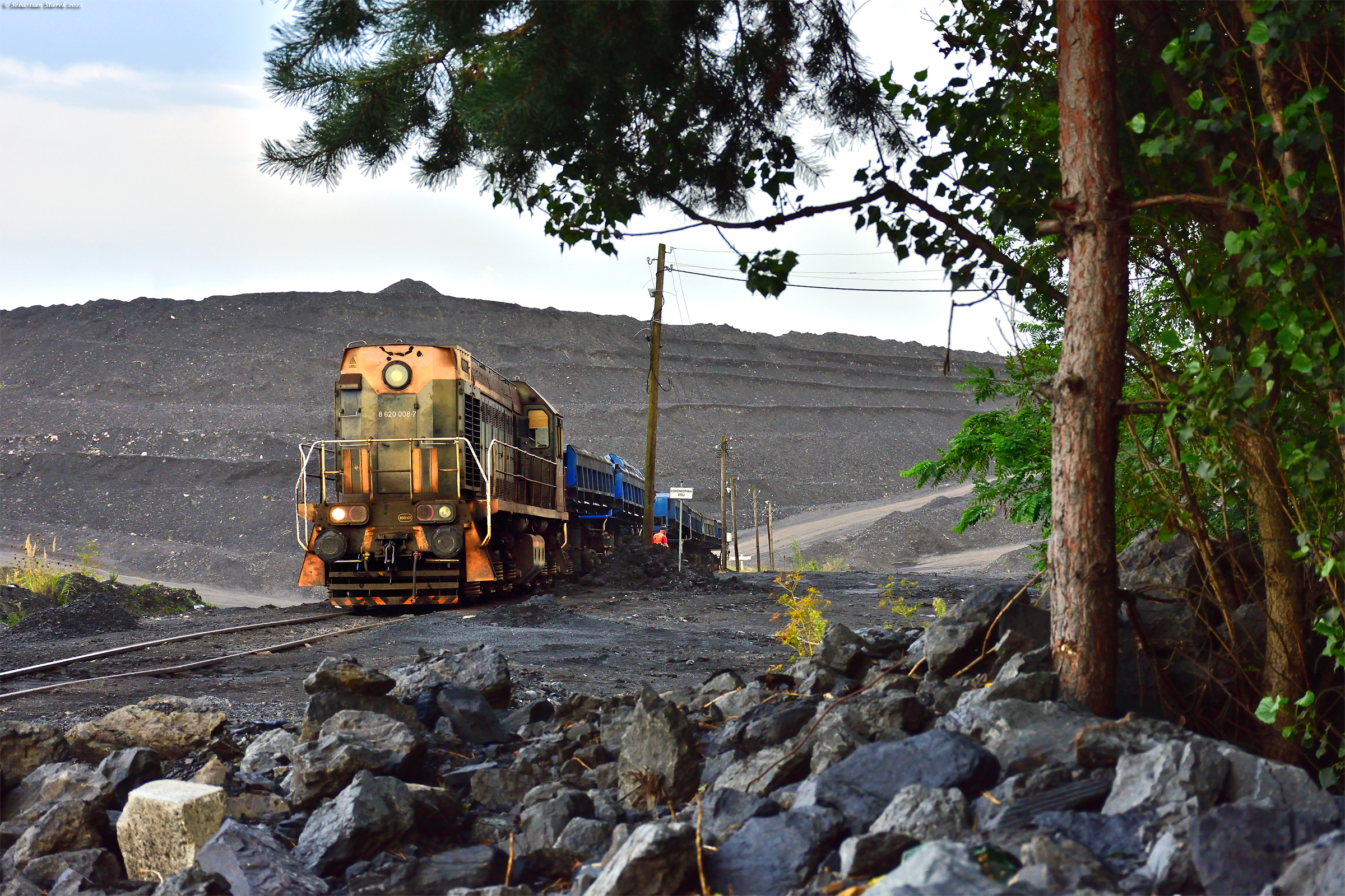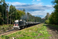 TEM2-276 ze składem wagonów samowyładowczych stoi podczas rozładunku odpadów górniczych na terenie zwałowiska Kopalni Węgla Kamiennego w Knurowie.