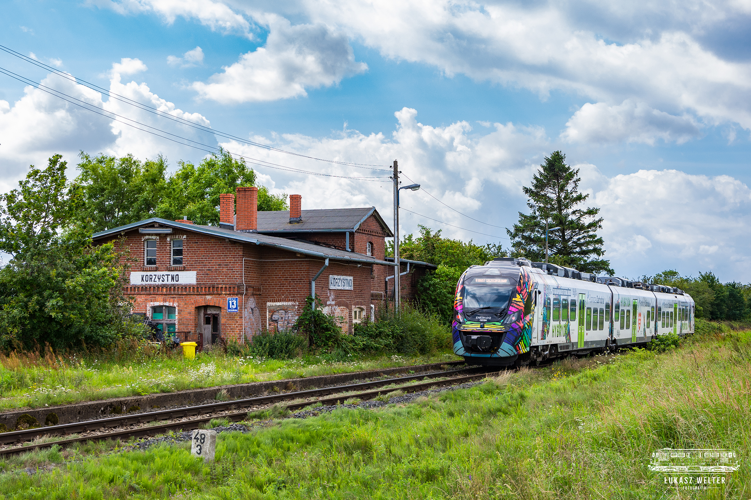Hybrydowa jednostka Zachodniopomorskiego Zakładu Polregio o numerach EN63H-012, na biegu mija dawny przystanek w Korzystnie na linii D29-402, kierując się z Kołobrzegu do Szczecina Głównego.