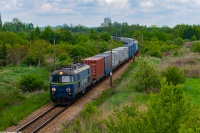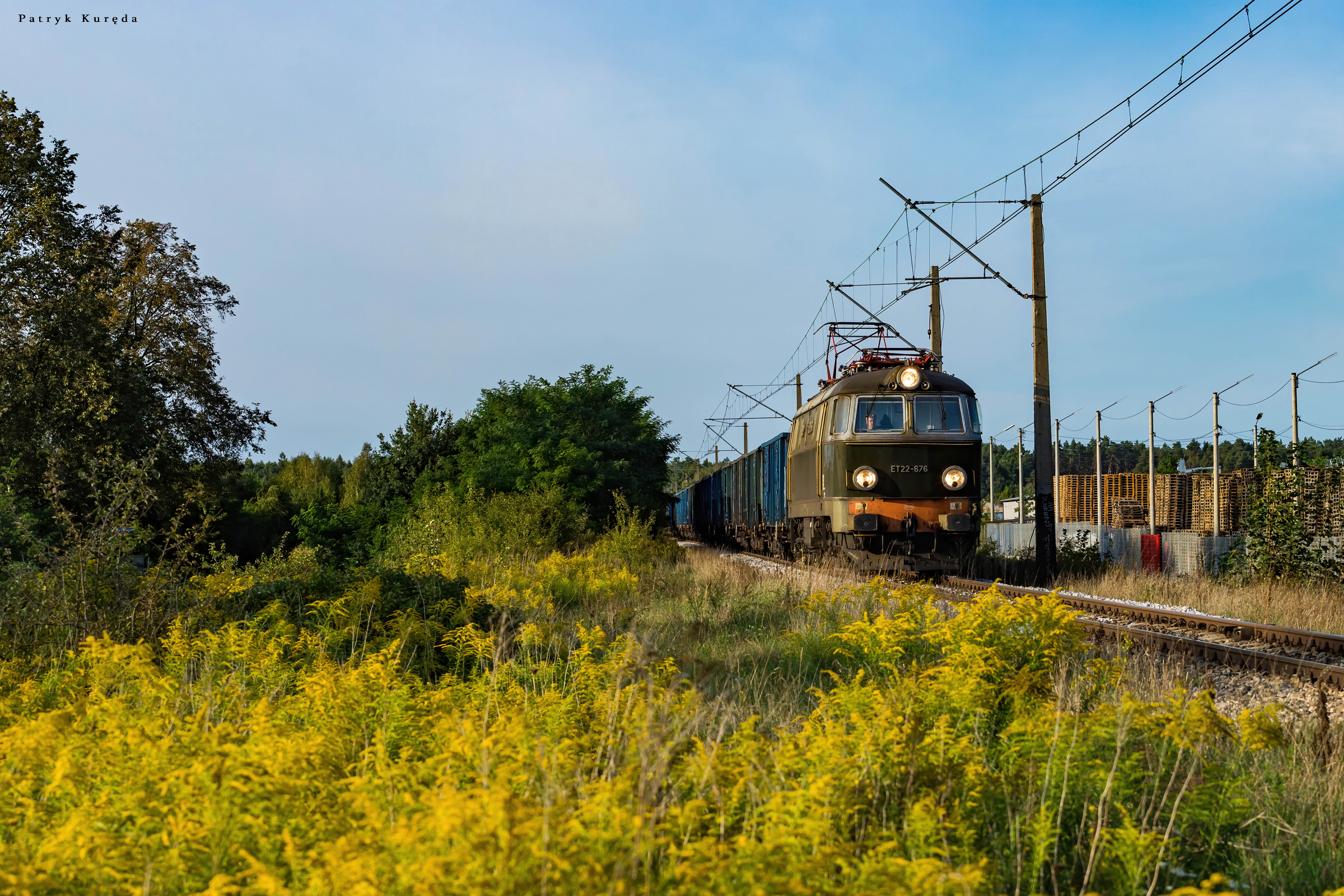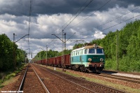 ET22-676 ze składem węglarek relacji Goworki-Gdańsk Port Północny za chwilę minie na biegu stację w Wyszkowie w kierunku Tłuszcza.