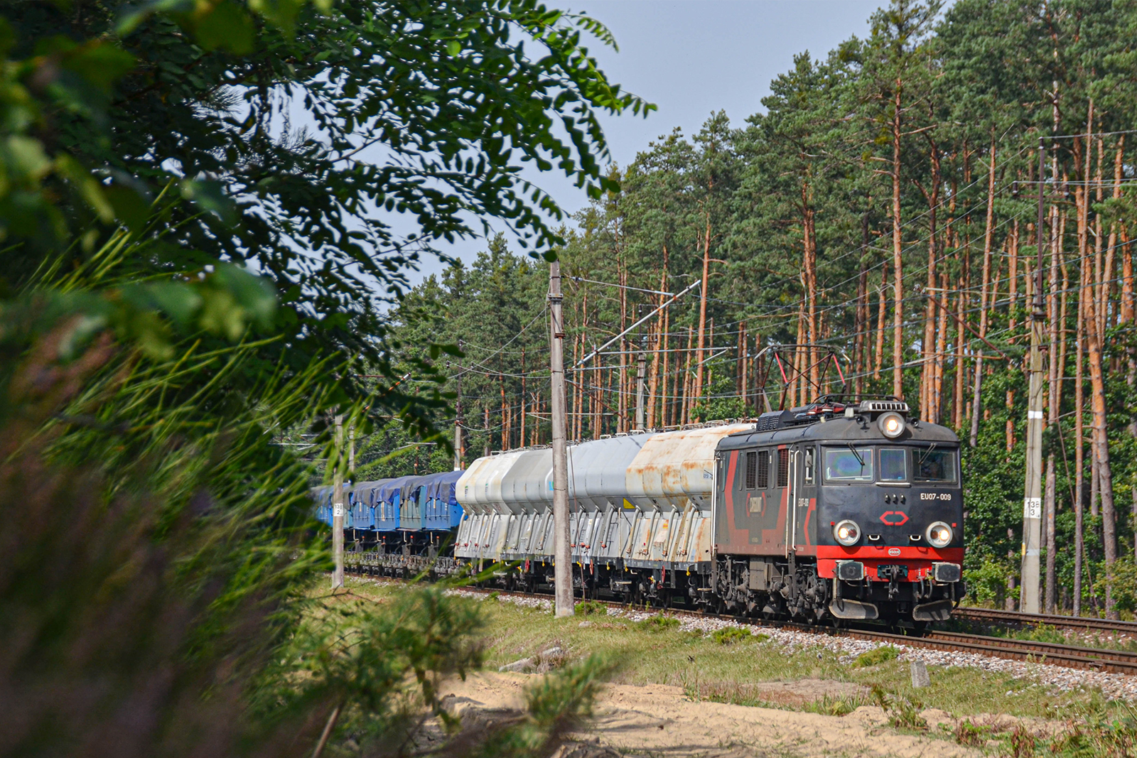 Wypożyczona do ZIK Sandomierz EU07-009 prowadzi skład paru gruszek oraz wagonów samowyładowczych z piachem do Muniny pokonując szlak Łętownia - Nowa Sarzyna. Widoczny skład po skończeniu biegu w Muninie zabierze stonkan a teren Huty Szkła Jarosław