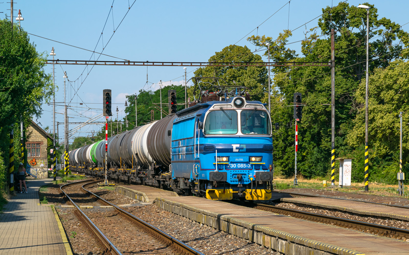 230 085 ČD Cargo Slovakia ze składem cystern przejeżdża przez stację Bernolákovo i jedzie w kierunku Galanta.