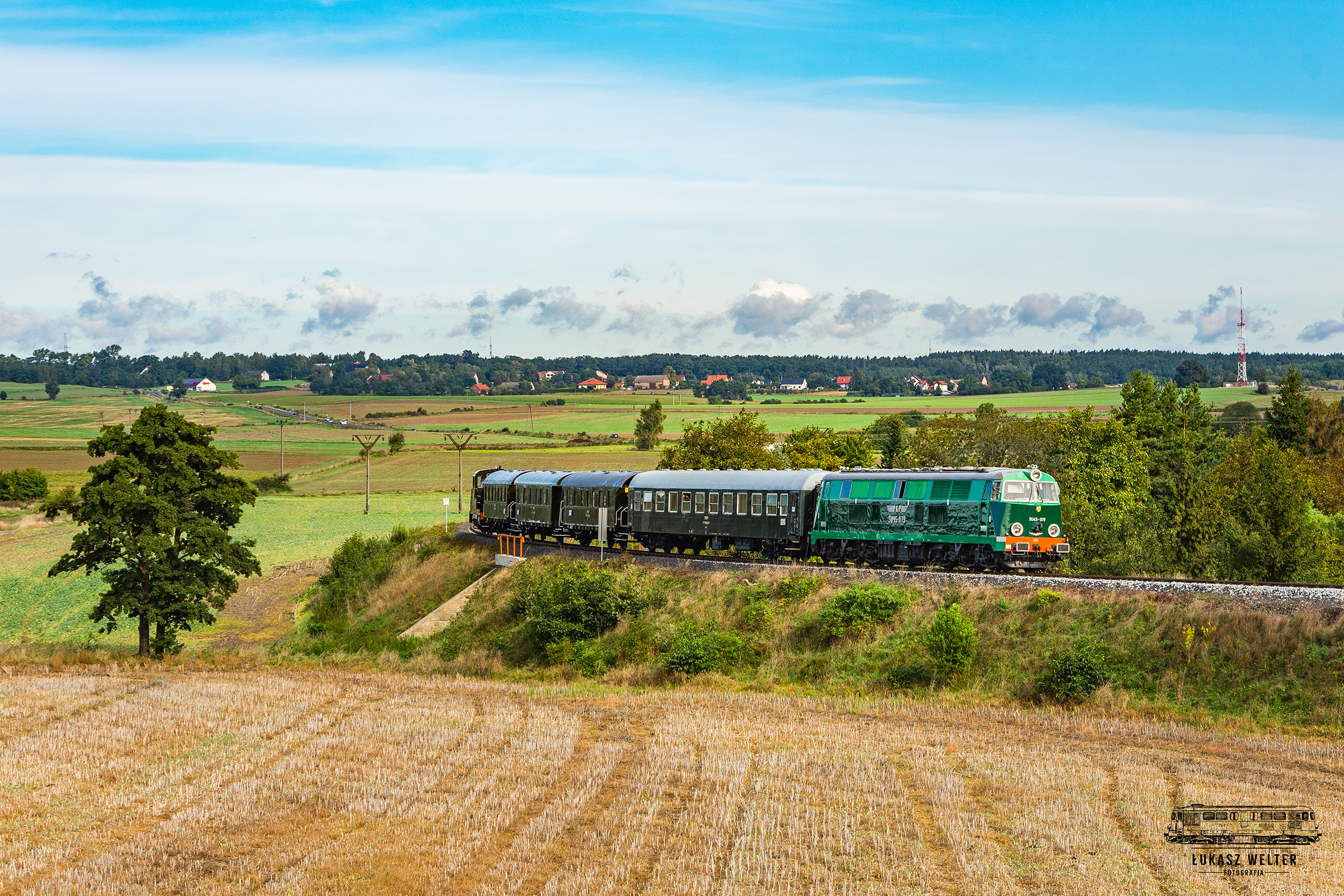 Pociąg specjalny zorganizowany przez KSK Wrocław dla niemieckich miłośników kolei, przemierza przepiękny łuk, na nowo wyremontowanej linii z Chojnowa do Rokitek. Skład dzień wcześniej nocował w Zgorzelcu, rano pojawił się w Chojnowie i po "zmianie czoła" w stacji wyruszył w kierunku Chocianowa.