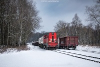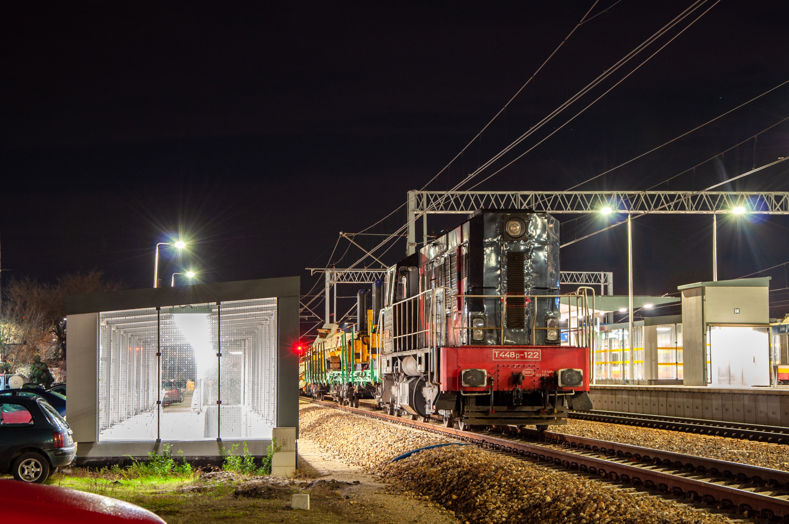 T448p Cargounit na czele wagonów z rozjazdami stoi wygaszony na torze 4 w Otwocku, kilka godzin później odjechał na Wawer rozładować rozjazdy dla modernizowanej LK7.
