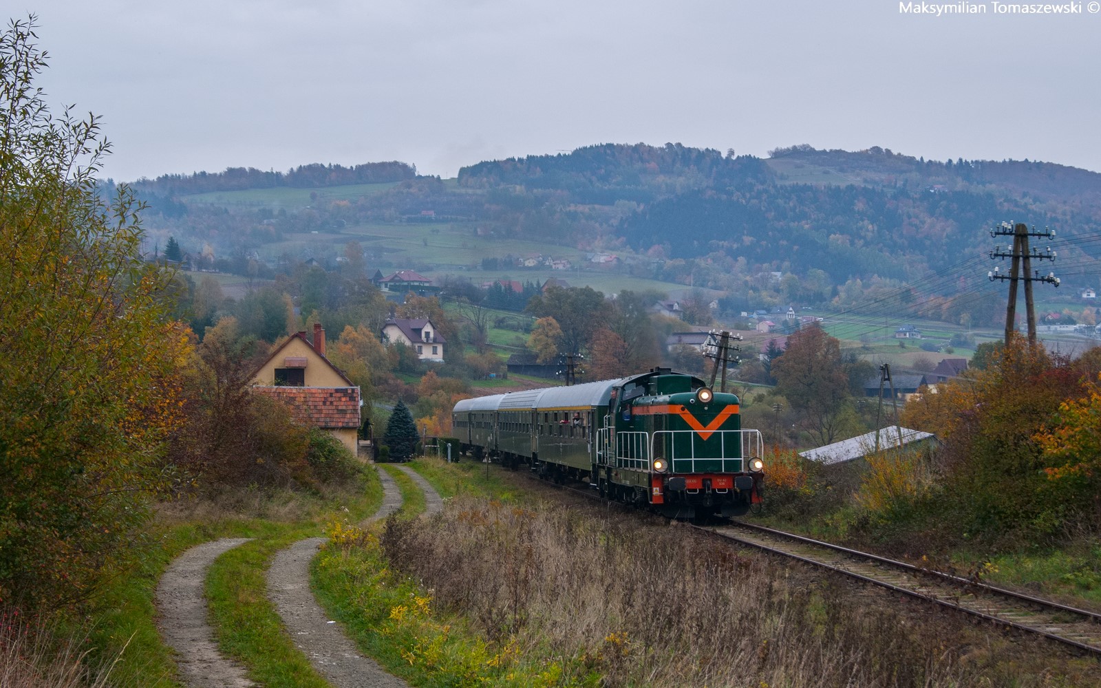 SU42-536 z pociągiem specjalnym "Sentyment" Turkol-u pokonuje klimatyczną linię 104 tzw. "Galicjankę". Skład mija zabudowania wsi Chomranice w tym widoczny po lewej dawny kolejowy budynek. Był to ostatni skład pasażerski, który pokonał odcinek Chabówka - Nowy Sącz przed modernizacją.