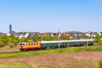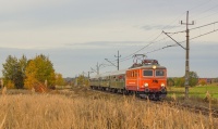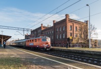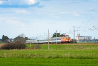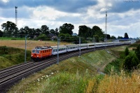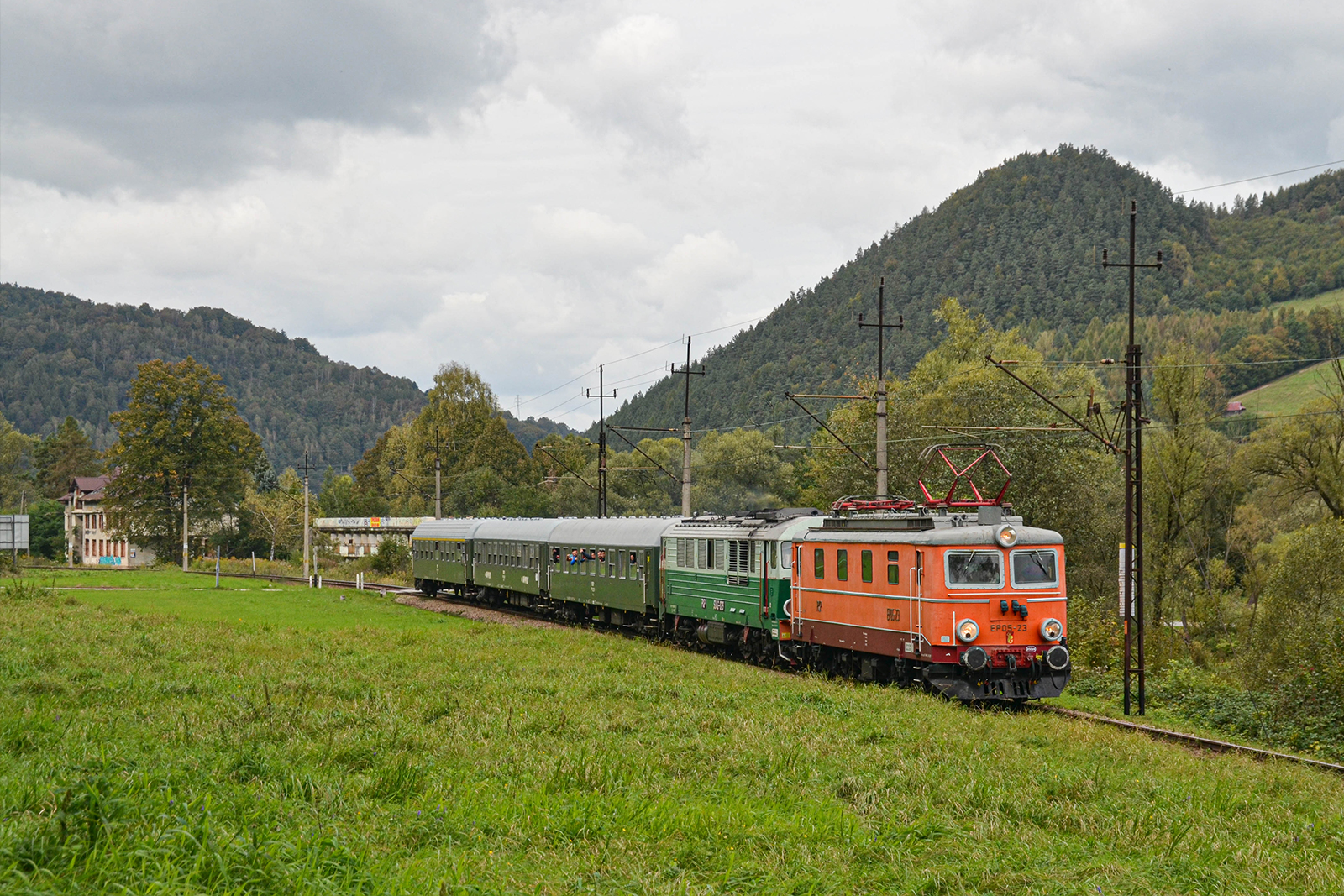 EP05-23 wraz z SU46-029 prowadzi pociąg specjalny "Nikifor" do Krynicy Zdrój jadąc szlakiem do Piwnicznej wzdłuż rzeki Poprad