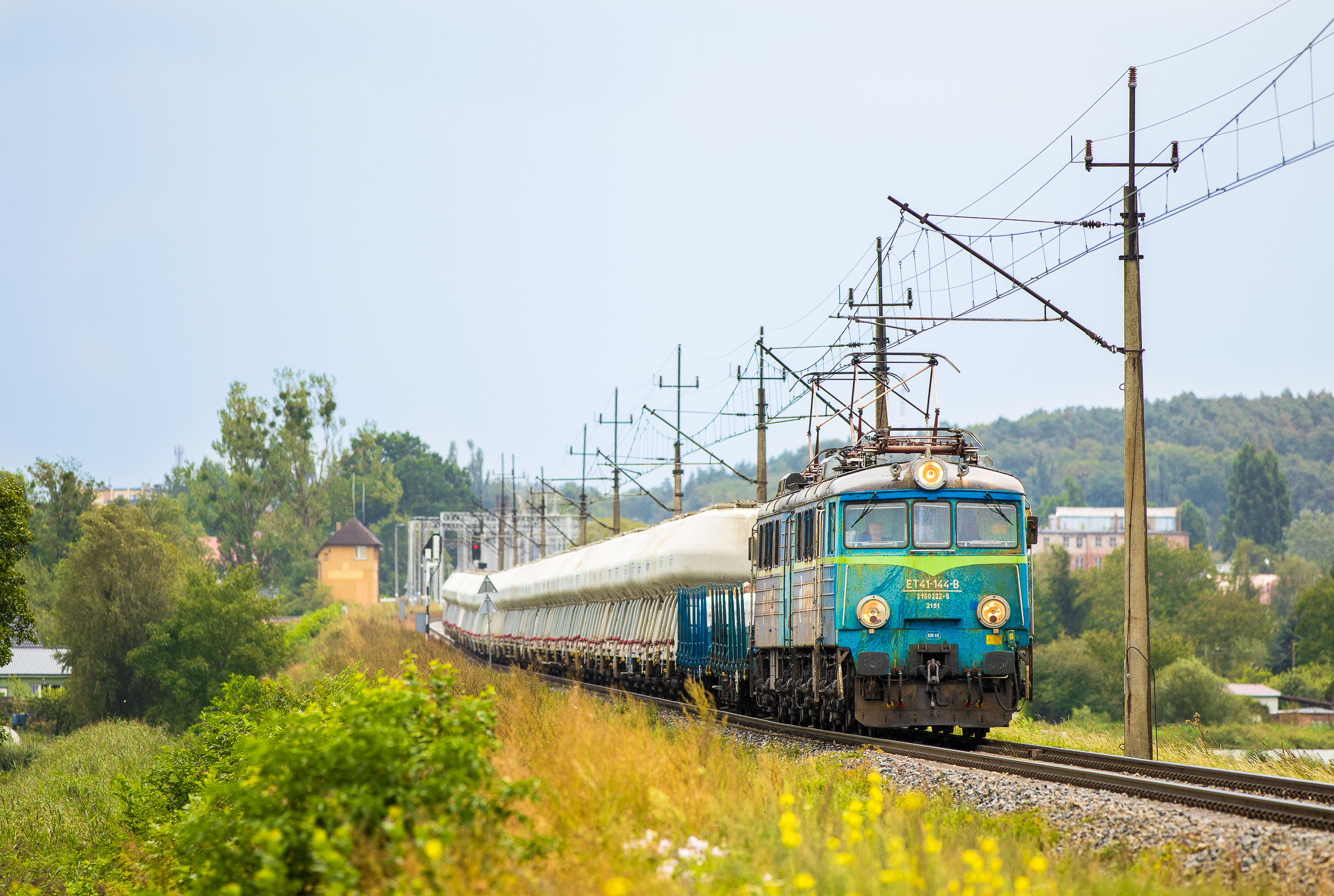 Brak weny do fotografowania kolei w moim przypadku nadal trwa. Jednak przeglądając stare zdjęcia natknąłem się na to, pomyślałem więc, że może być interesujące. ET41-144 z mieszanym składem gruszek i platform, opuszcza Chodzież w ciepłe, sierpniowe popołudnie.