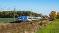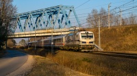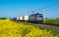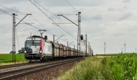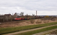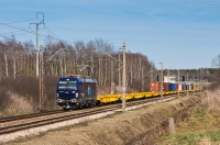 Skład platform z Vectronem na czele zbliża się do Miłkowic szlakiem od Chojnowa.