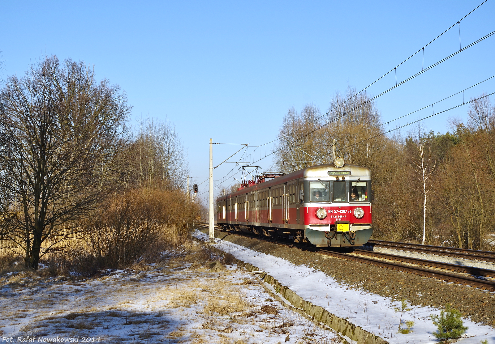 Klasyczny PeeRowski EN57-1267 jako Regio relacji Koluszki - Częstochowa opuścił przed chwilą stację Rokiciny i zajmuje szlak do Bab.