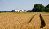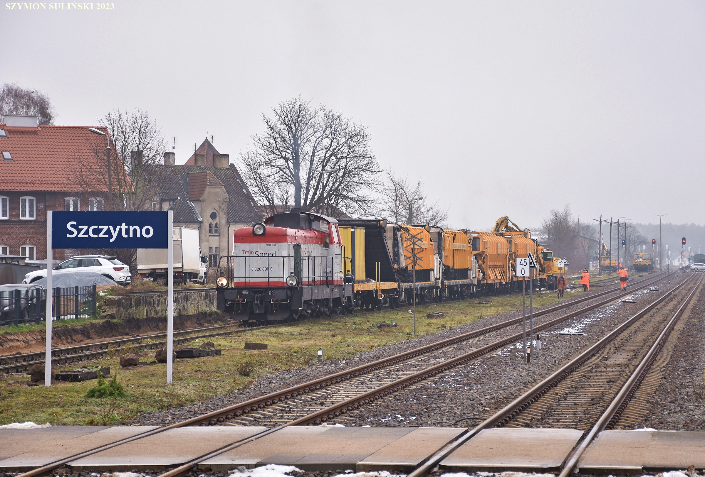 SM42-392 należąca do Train Speed stoi razem z maszyną torową na torze 6 stacji Szczytno. Trwają prace przy remoncie toru ładunkowego 8 na tej mazurskiej stacji.
