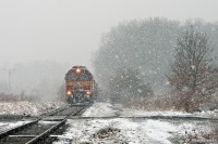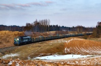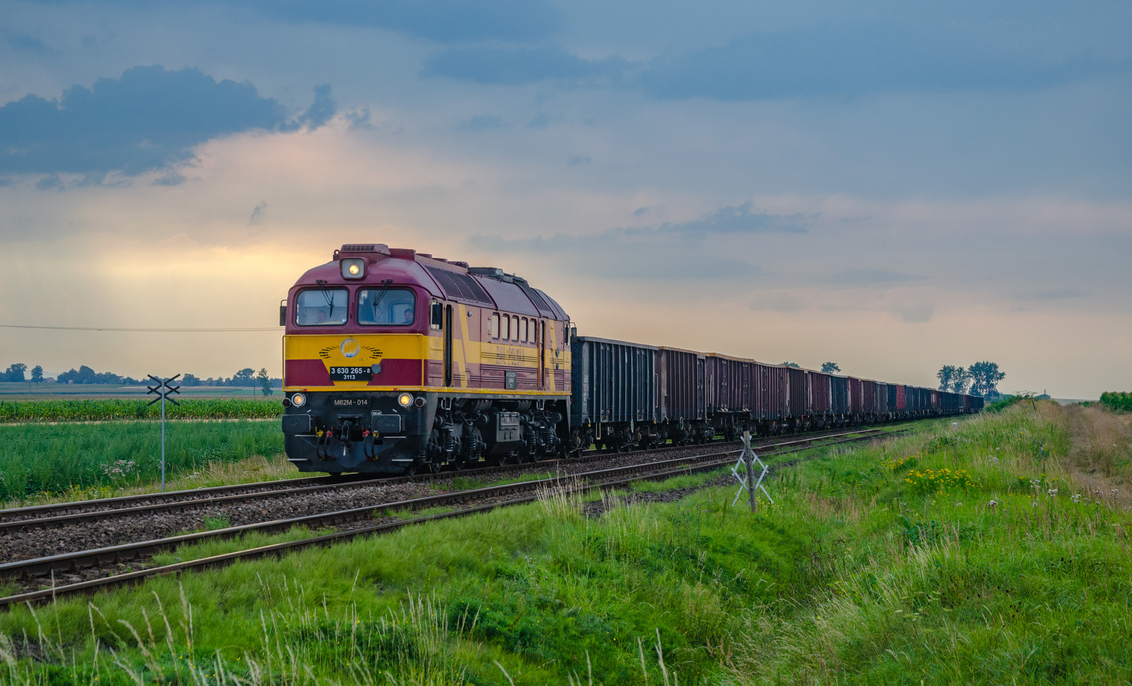 M62M-014 Railpolski z węglarkami jedzie magistralą "podsudecką" w stronę Prudnika powolnym tempem zbliżając się do przystanku osobowego Szybowice.