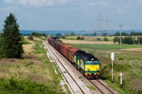 ST44-2061 wraz z ST44-2030 i ST44-2006 prowadzi skład węglarek rozpoczynając podjazd pod górkę zbliżając się do resztek byłego przystanku osobowego Ciosmy kierując się na Hutę Deręgowską