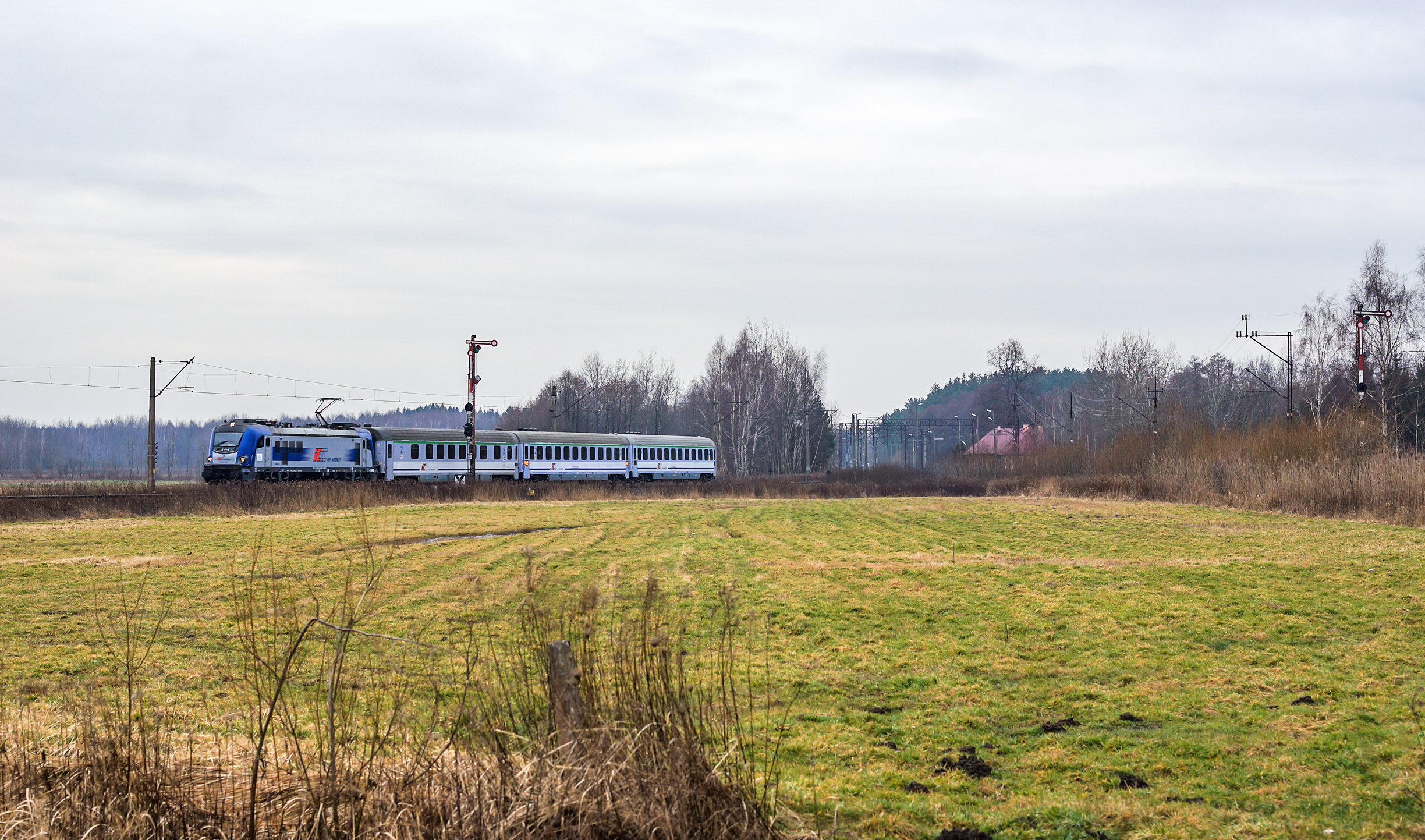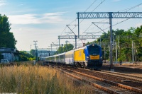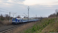Niezidentyfikowany EU160 na czele "Zamoyskiego" wyjeżdża z Sobowa w kierunku Grębowa. Mija wjazdowy semafor kształtowy.