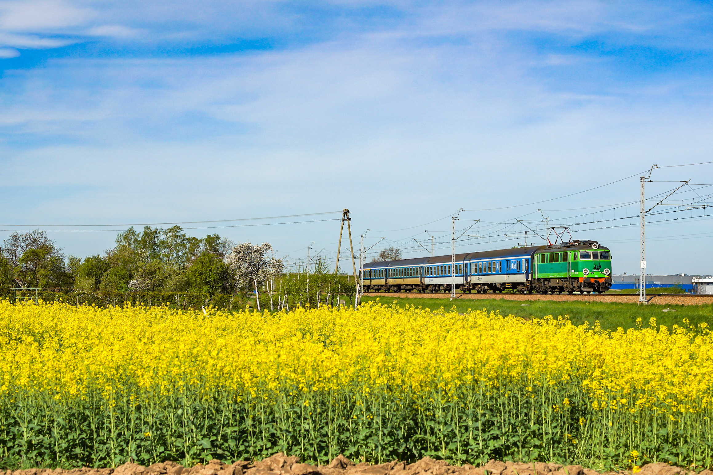 Kolorowy pociąg, czyli zielona EU07-052 i niebieskie wagony TLK "Roztocze", jedzie szlakiem Dębica - Ropczyce, mijając pierwszy w tym roku rzepak.