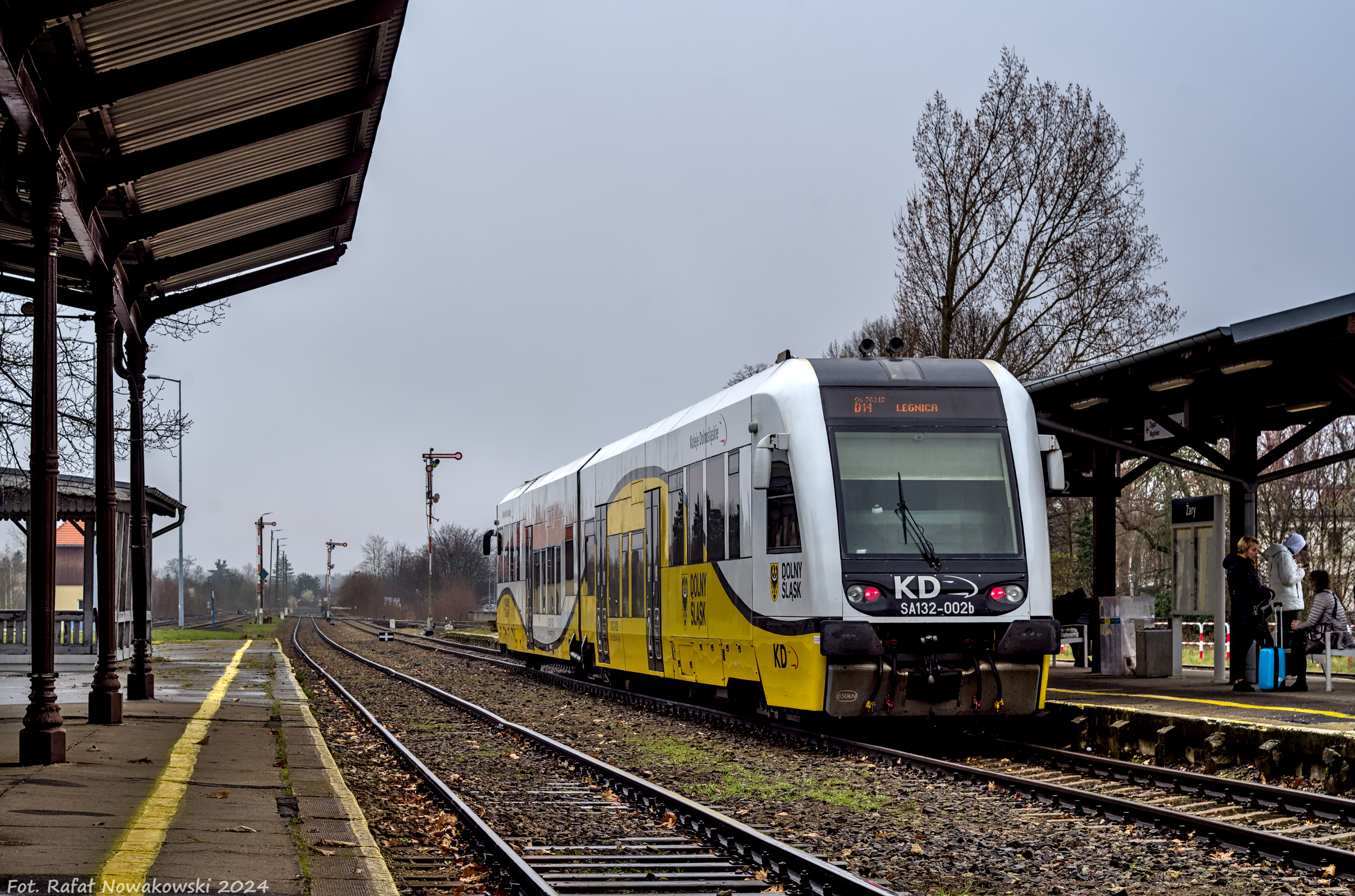 SA132-002 jako pociąg Kolei Dolnośląskich Os-76312 relacji Żary - Legnica oczekuje podania sygnału Sr3 i odjazdu 14-stką do Żagania.