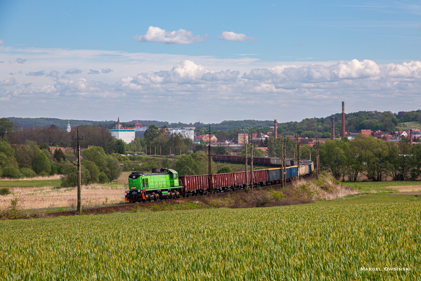 TEM2-145 na popychu ładownego pociągu Poltransu jako BR System z Doboszowic do Konina wije się na łuku, zbliżając się do stacji w Ziębicach. Na czele składu ET22-5331.
