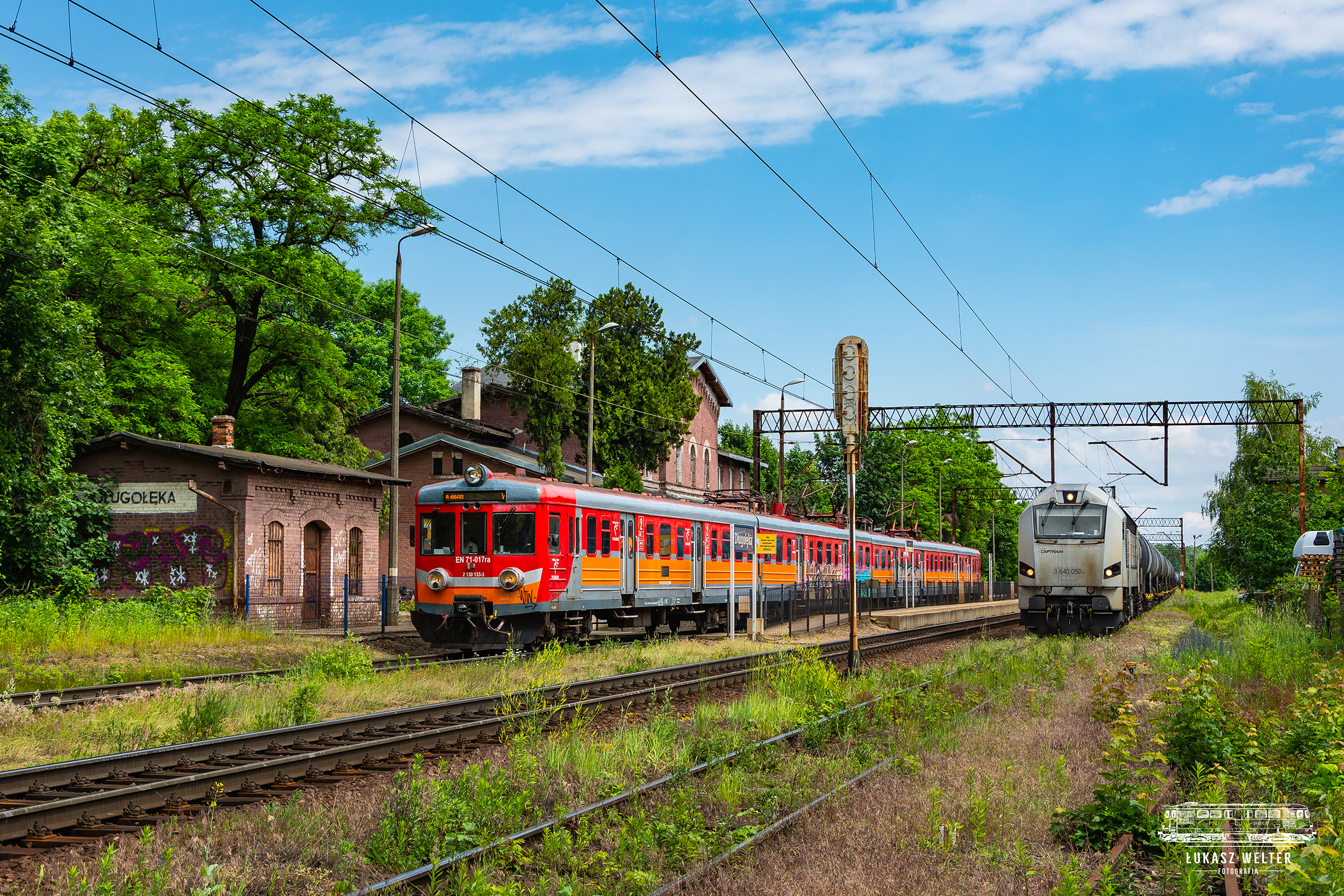 EN71-017 należący do Dolnośląskiego Zakładu PolRegio odjeżdża z peronów stacji Długołęka. Jednostka wykonuje kurs w relacji Lubliniec-Wrocław Główny.