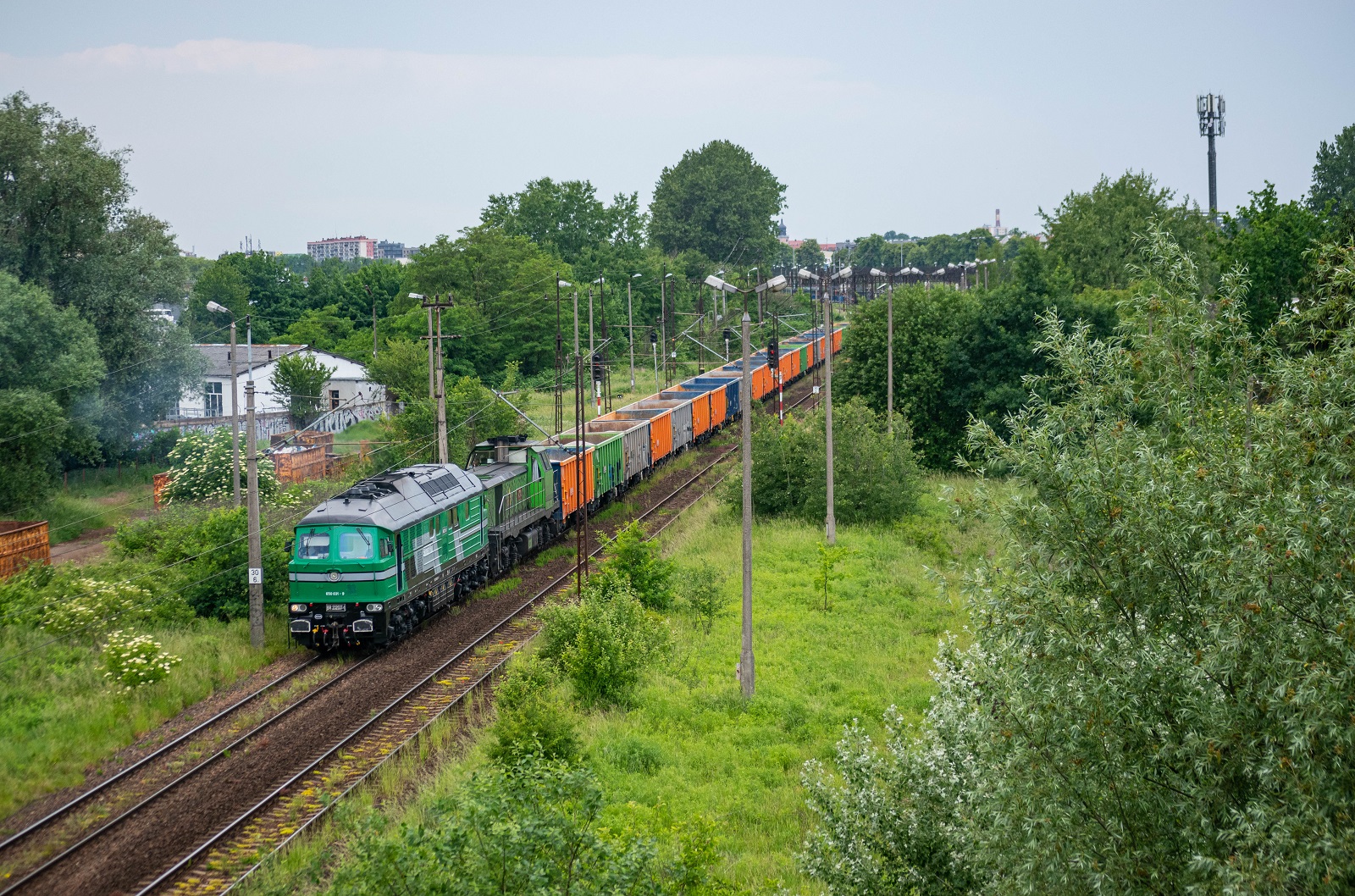 Duet przewoźnika GB Rail w postaci BR232 537-1 oraz 15D-111 przetaczają wagony pełne żwiru na pobliską rampę wyładunkową.