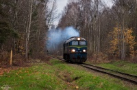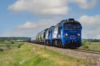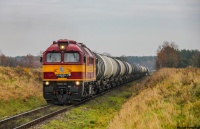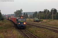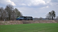 M62-1202 prowadzi krótki skład beczek z Goświnowic do Chałupek (Ostravy), przejeżdżając przez perony w Przełęku.