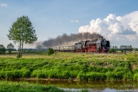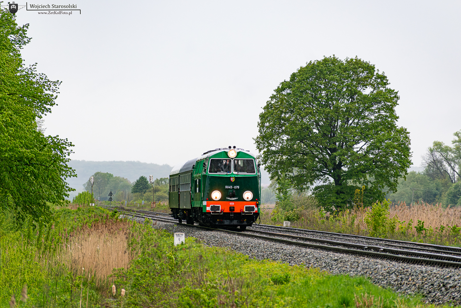 SU45-079 z dwoma wagonami jedzie szlakiem Paczków-Kamieniec Ząbkowicki w kierunku Paczkowa.