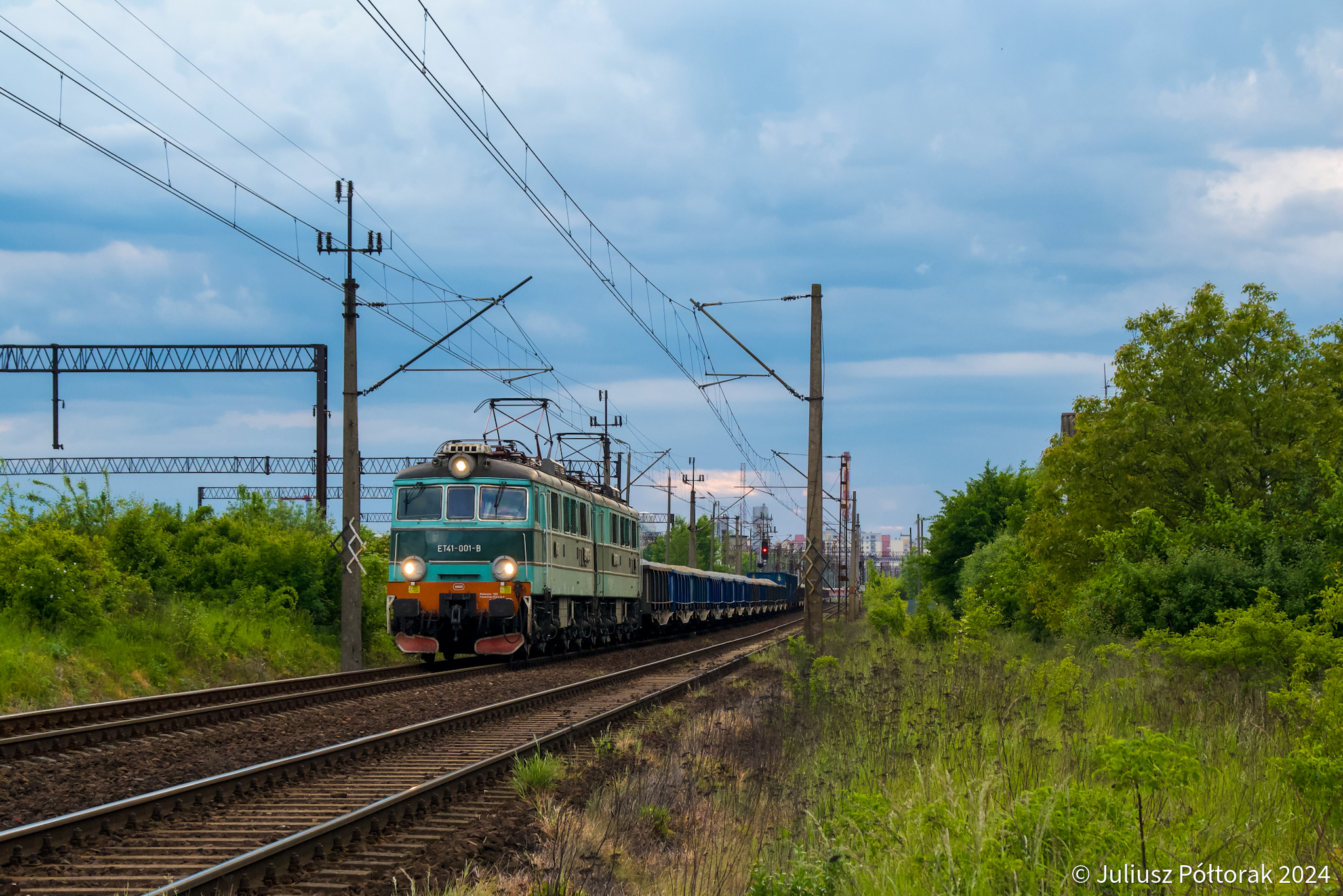 ET41-001 w historycznej malaturze, jeżdżący dla PKP Cargo rozpędza się na wyjeździe z Malborka z pociągiem TME 654044/5 relacji Strzegom - Stare Pole składającym się głównie z węglarek niskoburtowych wspomnianego przewoźnika.