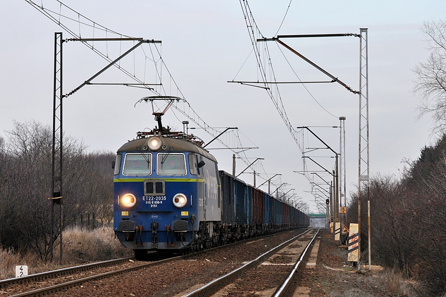 Rzadki gość na łódzkich szlakach (seria ET22-20xx), w postaci ET22-2035 wraz ze składem węglarek jedzie w stronę Lublinka. Pół godziny później będzie wracał z innym składem węglarek w stronę podg. Retkinia.