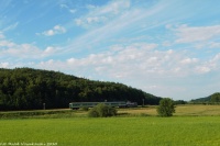 Stonka SM42-768 TrainSpeed z krótkim składem dumpcarów Dolkomu jedzie szlakiem podg. Szczedrzykowice - Malczyce w upalne lipcowe przedpołudnie. Pociąg minie zaraz wiadukt na lokalnej drodze rolniczej ze wsi Dąbie.