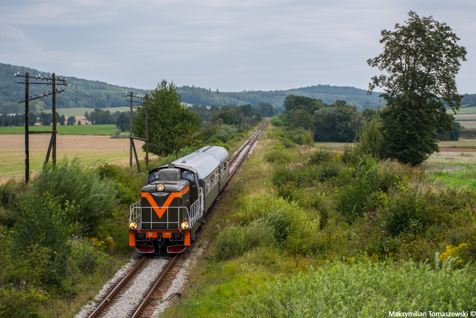 SP42-001 z pociągiem osobowym relacji Kamieniec Ząbkowicki - Jaworzyna Śląska zbliża się do Dzierżoniowa od strony Piławy Górnej.