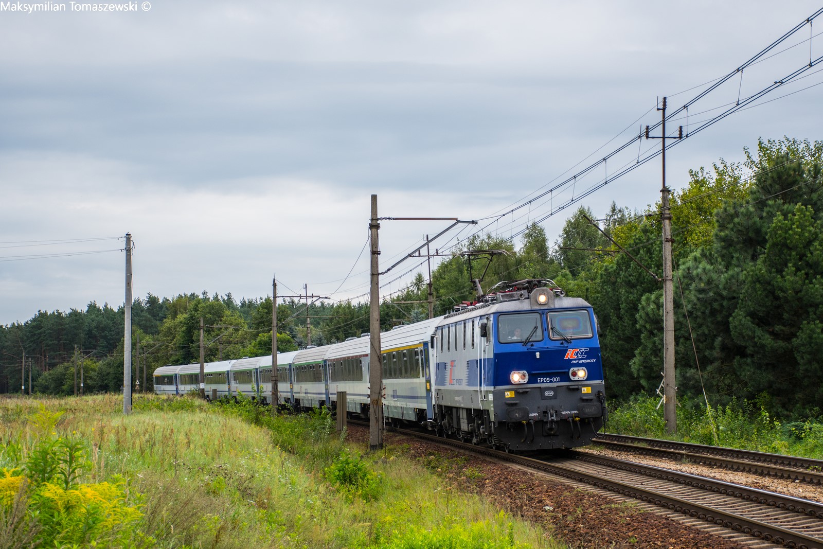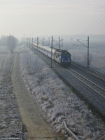 Najstarsza z dziewiątek, czyli EP09-001 z pociągiem IC 3804 Matejko relacji Przemyśl Główny - Szczecin Główny pokonuje ostatni łuk nadodrzanki przed stacją w Wołowie. Pociąg minie zaraz przejazd kolejowy na skraju wsi Piotroniowice.